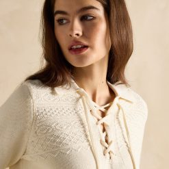 Designed for year-round wear, this versatile piece pairs effortlessly with your favourite jeans. Its textured knit detailing on the front yoke, collar, and lace-up neckline adds a stylish touch, while the deep ribbed hem and cuffs ensure a comfortable, flattering fit.