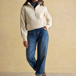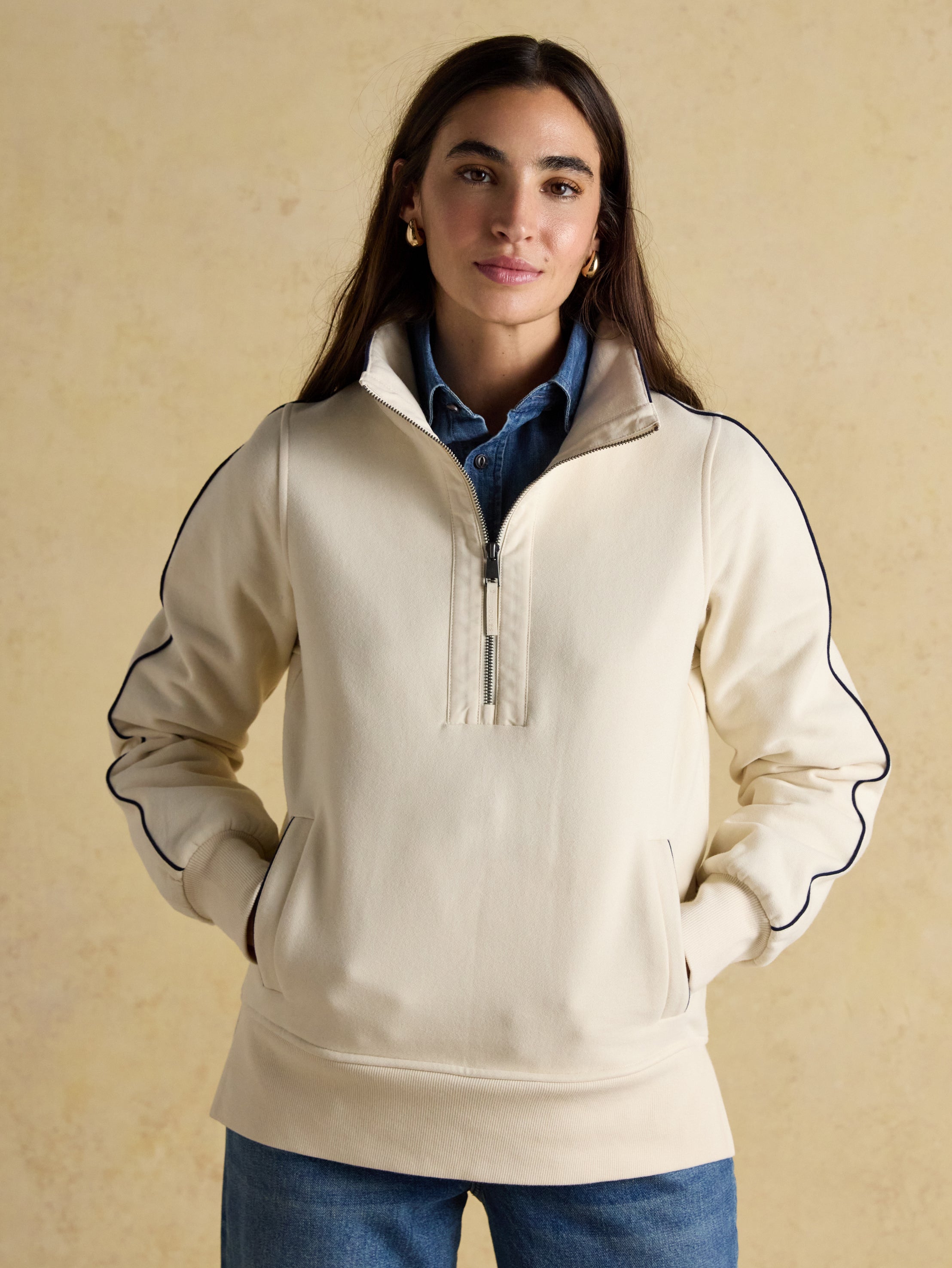 Joules Bronte Funnel Neck Quarter Zip Cotton Sweatshirt is a?go to layer for cooler days, the Bronte quarter-zip is crafted from 100% cotton with a cosy funnel neck, welt pockets and dropped shoulders. Finished with ribbed trims, a branded Joules zip and embroidered back neck detail smart solo or over a shirt.