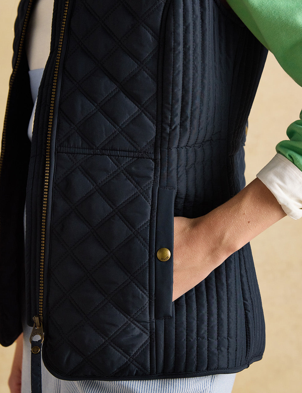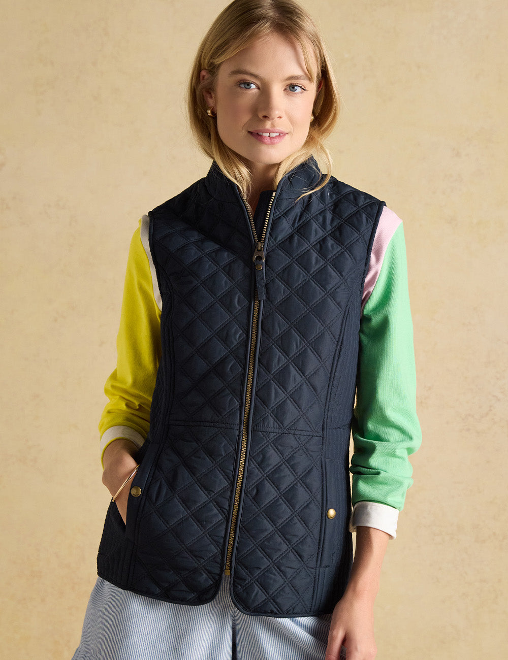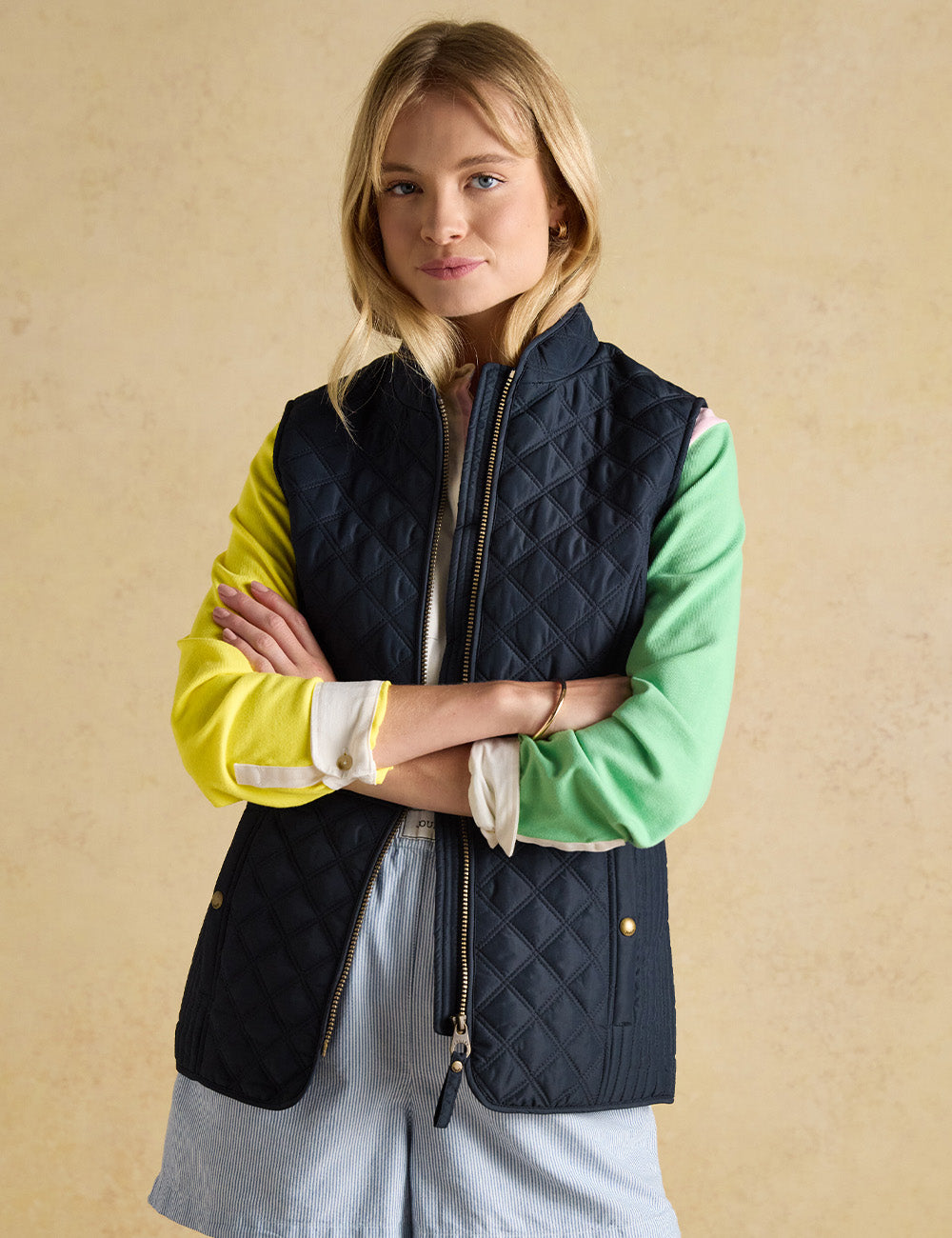 Crafted with diamond quilting and a zip-through fastening, this essential is designed to flatter and fit comfortably. Features include exposed metal poppers, pockets and an elasticated back channel. Perfect for all climates and occasions.