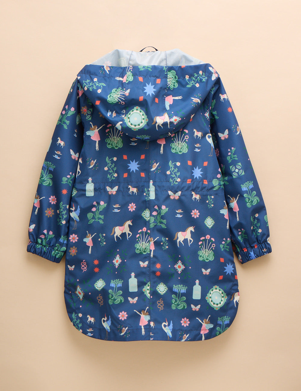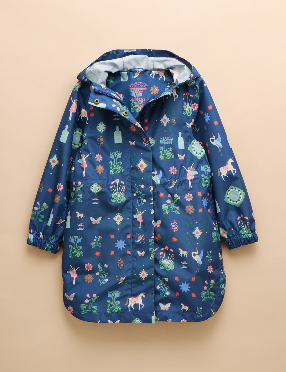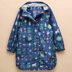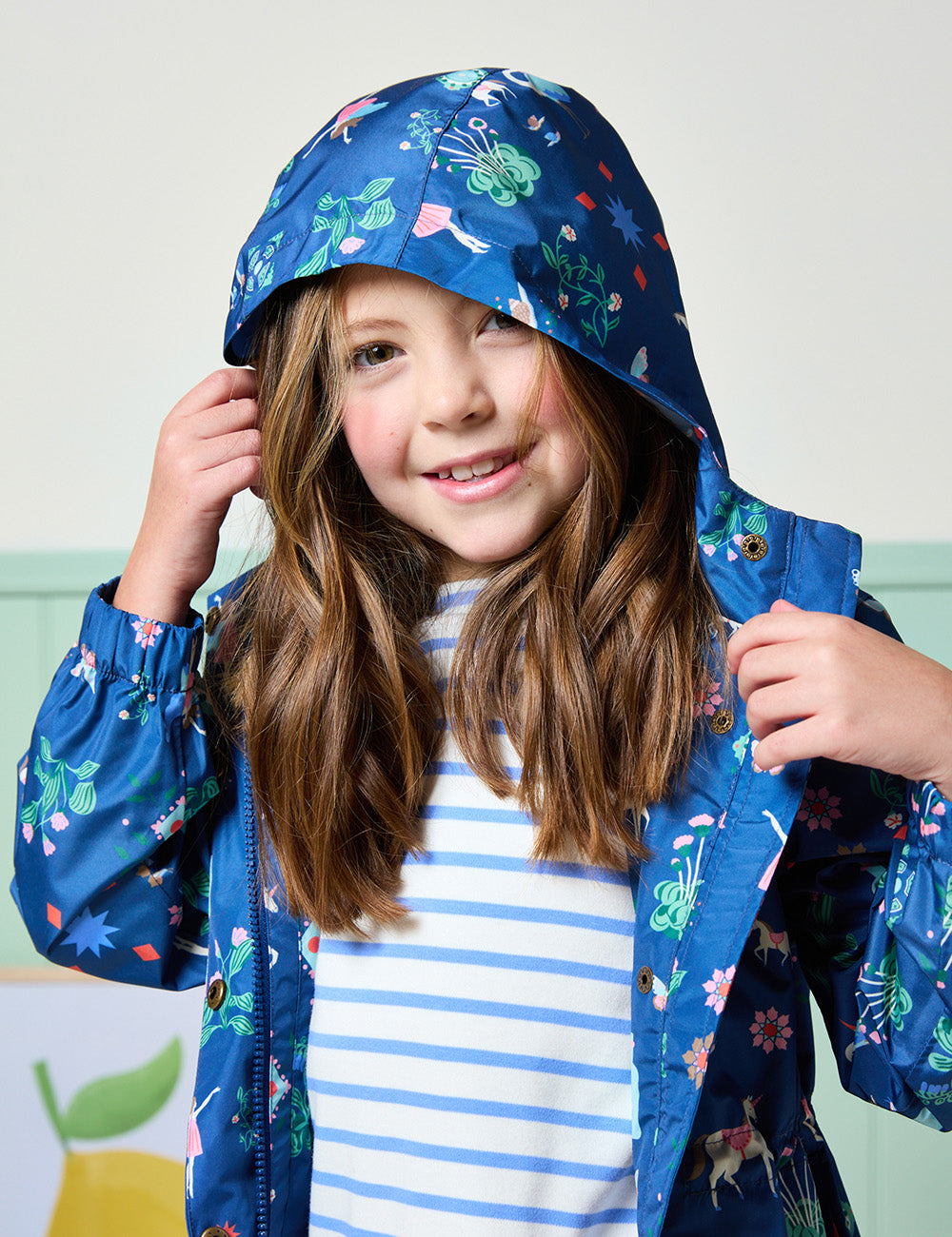 Crafted with a waterproof finish and fully taped seams, this stylish raincoat ensures dryness and comfort. Thoughtful features like a pack-away hood, elasticated cuffs, and an adjustable waist provide a tailored fit and convenience. The concealed zip and popper fastening, along with two side pockets, add practicality. Adorned with a charming print, this raincoat combines functionality with a sophisticated design your little one will love to wear.