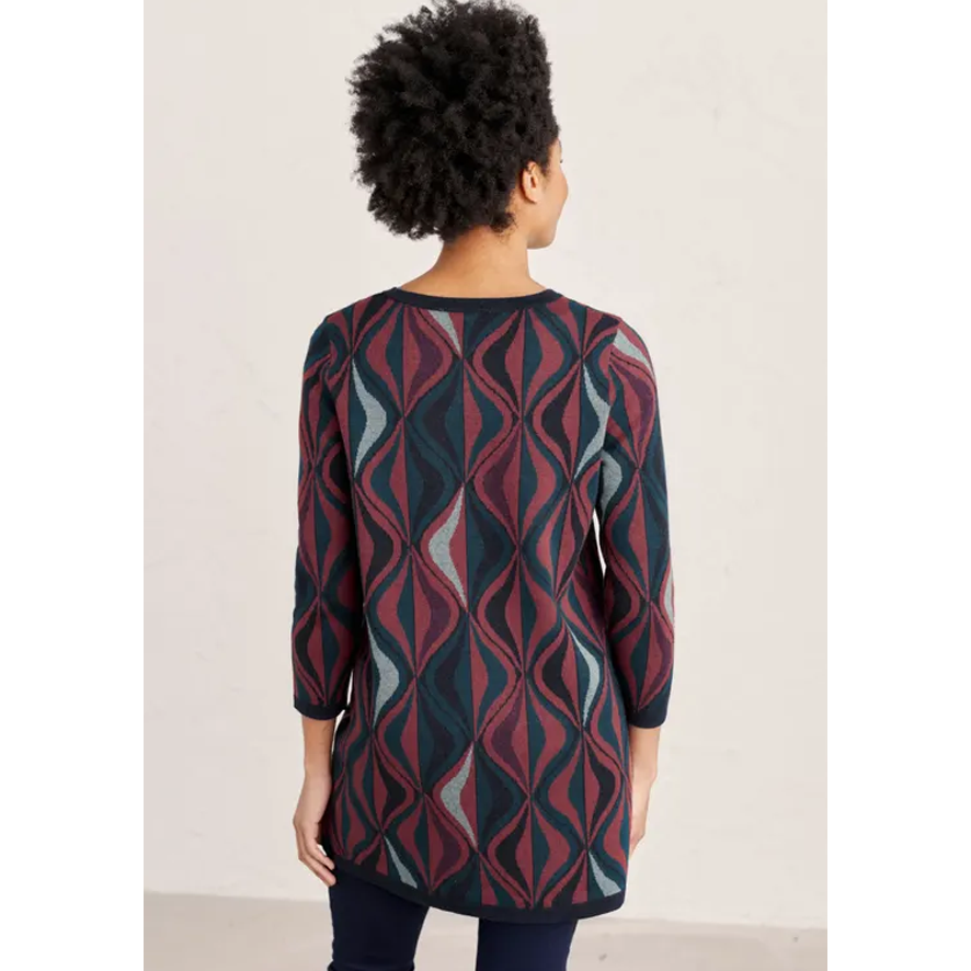 A striking A-line tunic made of jacquard knit. For weekend walks, pair it with boots and jeggings, or with leggings and smart shoes for a night out.