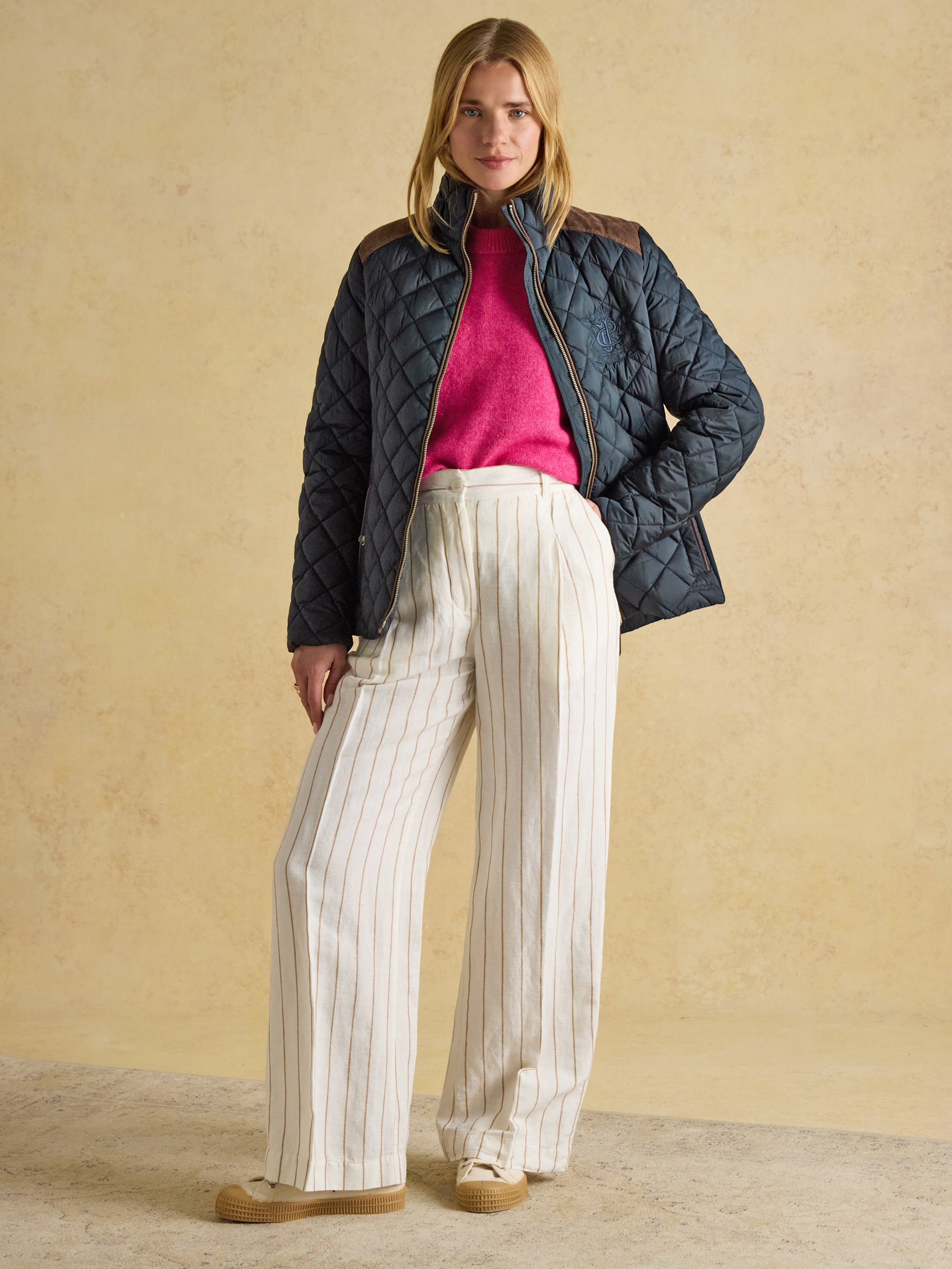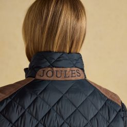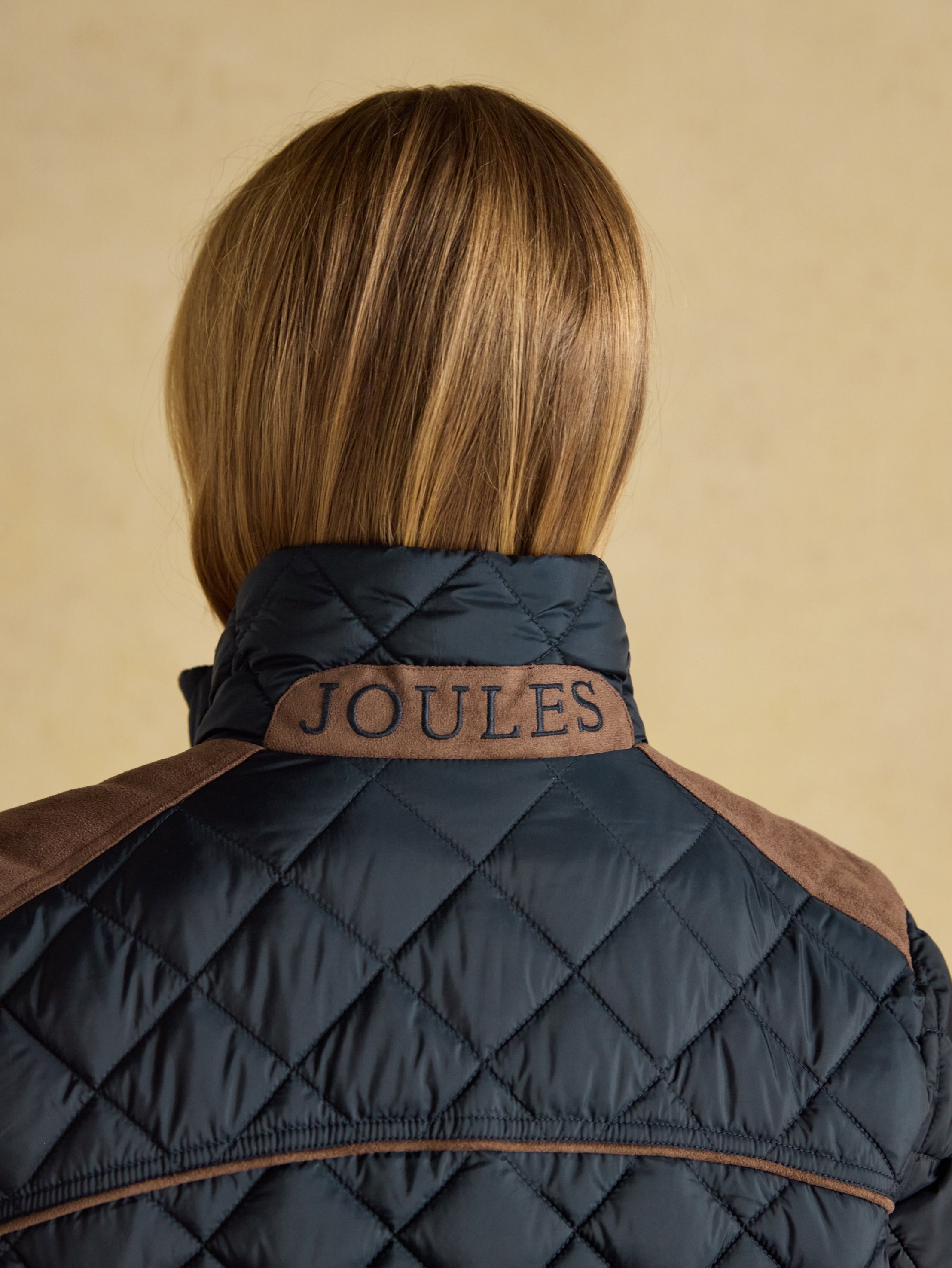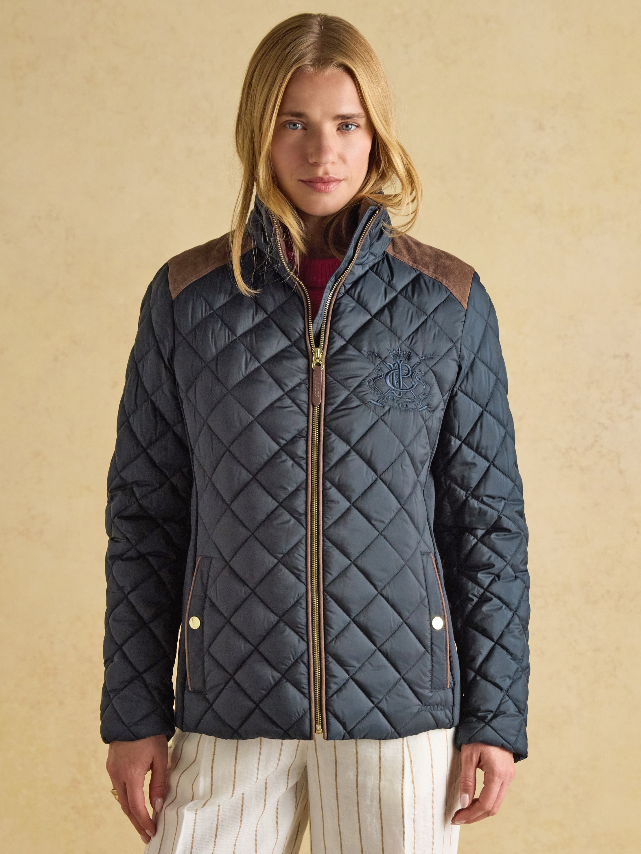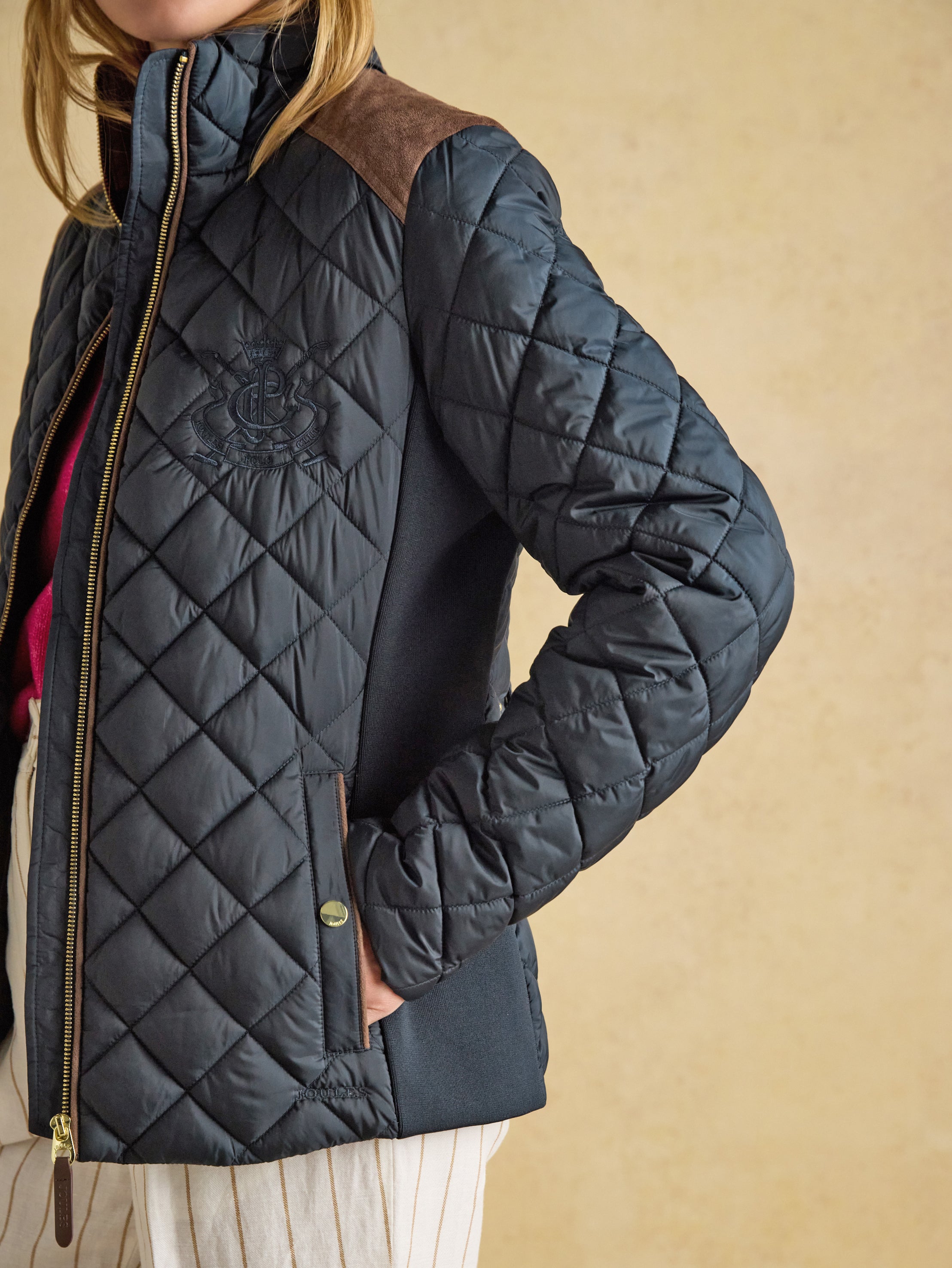 Celebrate timeless rural style with this quilted coat, designed in a flattering silhouette and finished with heritage-inspired details. Showerproof to withstand light rain, it features a traditional diamond quilt pattern, suedette-lined funnel neck, and suede shoulder panels for a refined touch. Thoughtful additions such as crest embroidery, a quilted back belt, and curved hem highlight its craftsmanship, while front popper pockets and a zip fastening ensure practicality as well as style.